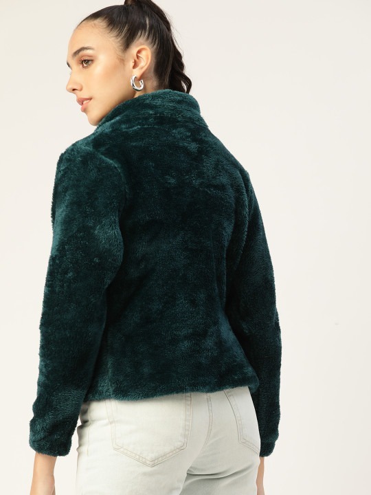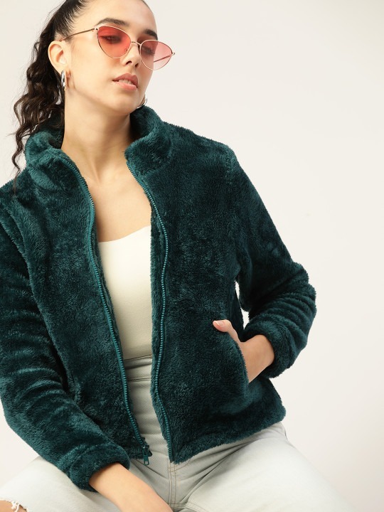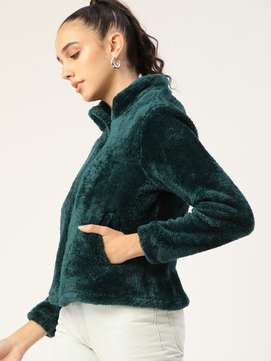 Green solid tailored jacket, has a mock collar, 2 pockets ,has a zip closure, long sleeves, straight hemline, without lining