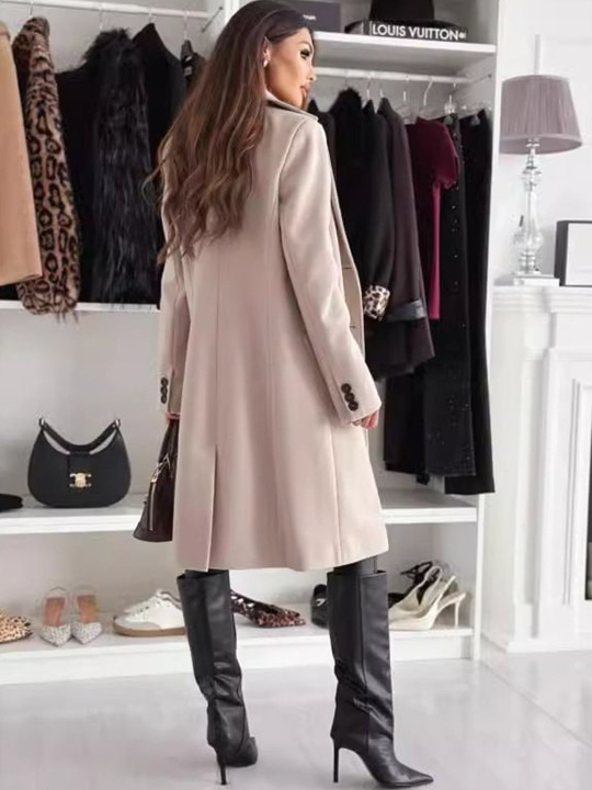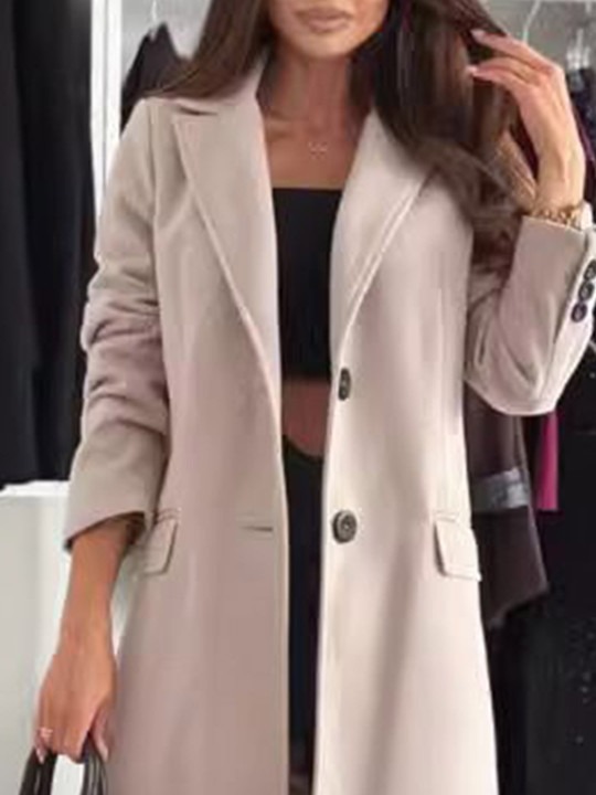 Beige solid open front jacket, has a lapel collar, 2 pockets ,has a button closure, long sleeves, straight hemline, polycotton lining