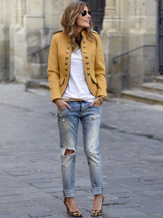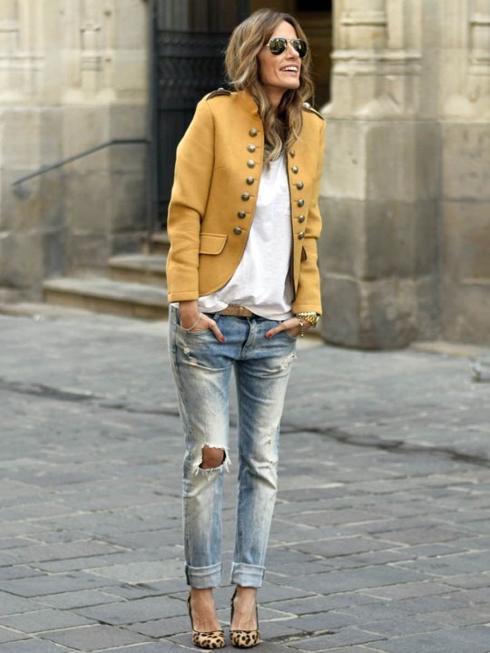 Yellow solid tailored jacket, has a stand collar, 2 pockets ,has a button closure, long sleeves, straight hemline, without lining